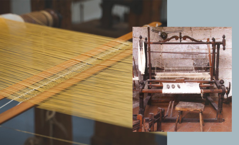 la trama, facendo passare i fili orizzontali (trama) attraverso l'ordito tramite grandi navette di legno. Filo per filo e riga per riga, la trama viene agevolmente posizionata.