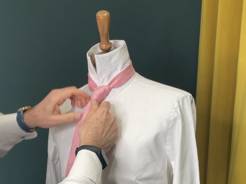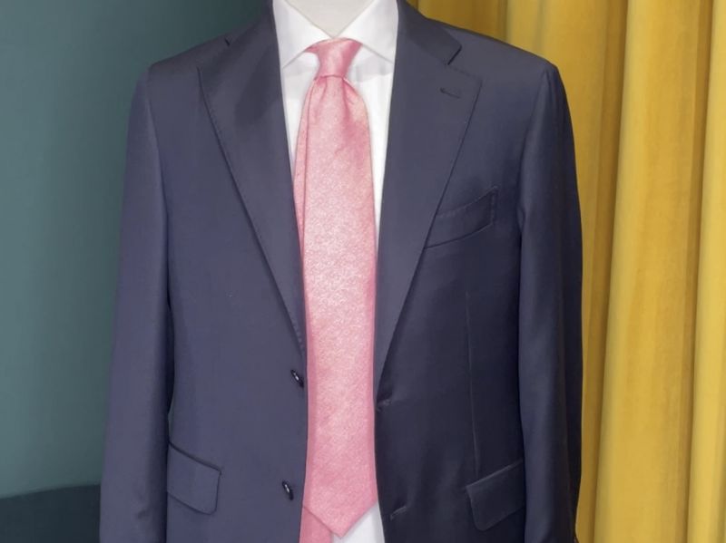 Per andare ad aggiungere un pizzico di colore sopra la nostra camicia in Zephir, prendiamo una cravatta Sette Pieghe in rosa fenicottero. La sua trama lavorata a mano permette alla cravatta di rimanere ben consistente intorno al collo e sul nodo Four in Hand. Le sette pieghe in cui è piegata questa pregiata cravatta permettono di avere la certezza che sia fabbricata a mano, mentre la trama del tessuto ci assicura la qualità della sua seta. La annodiamo stringendola bene e abbassiamo il colletto della camicia. La seta di questa cravatta ha la caratteristica di essere davvero radiosa e di riflettere la luce con dei riflessi rosa confetto. Nonostante il rosa non sia un colore con cui tutti gli uomini si sentono a proprio agio, in questo caso la cravatta non risulta eccessiva e andremo subito a equilibrarla con la giacca.