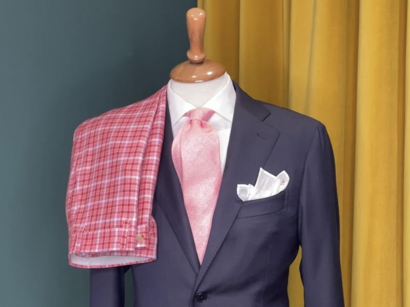 A questo punto sopra alla cravatta rosa fenicottero, abbiniamo un blazer blu molto classico in un tessuto four season. La lana di questo blazer è perfetta per tutte le stagioni perché conserva il calore del corpo senza appesantirlo. Una giacca come questa è il capospalla più versatile che potrete trovare: potete infatti indossarlo a lavoro per un look più classico e sobrio, ma se come in questo caso date luce e brio al look con dei dettagli frizzanti, il suo blu scuro si accenderà immediatamente. Proseguendo in questa direzione, aggiungiamo un tocco di corallo nella parte inferiore: scegliamo un pantalone multicheck sui toni del corallo e del rosa che richiama la cravatta e spezza la tinta unita della giacca. Questo pantalone in lana e cotone è anch'esso perfetto per la stagione estiva e la sua fantasia vivace si sposerà benissimo con la giacca tinta unita.