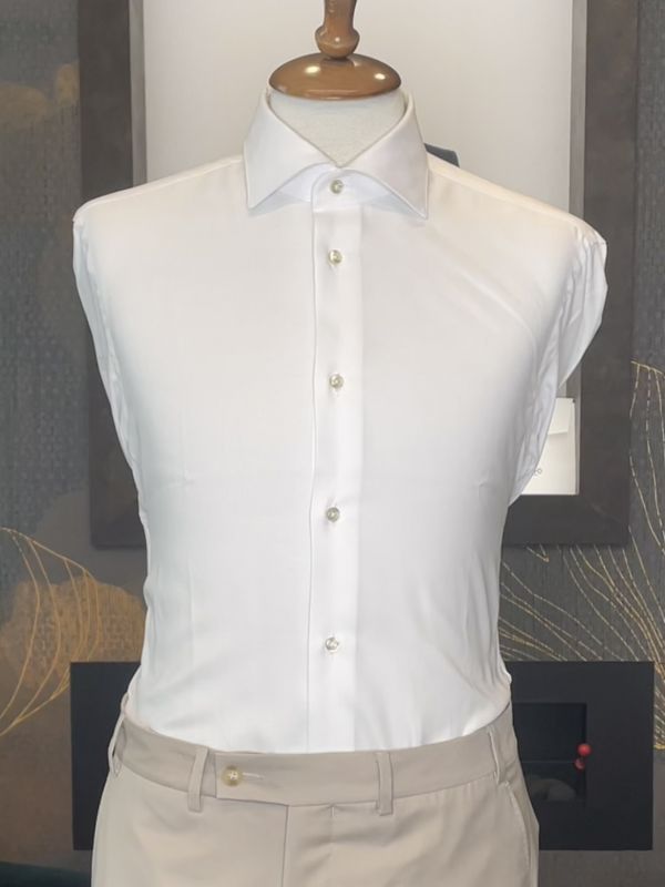 Let's start composing this look in two variations from a very simple common base. In fact, first of all we choose a shirt in fine cotton Zephir, bright and fresh on the skin. Thanks to the natural fiber of cotton, even in summer it will always remain dry, while in winter it will be the best fabric to use so as not to notice the wool tank top that you could wear underneath. We then position the shirt and button it up to the collar, then immediately combine a pair of very light cool wool trousers in a light hazelnut neutral color.