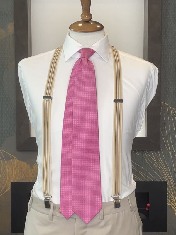 Another accessory that can make a difference are the suspenders: do you use them? Compared to the belt, the suspenders are able to more slender the figure of the man. Remember when you wear them to first tie them at the back and then slide them in front. The suspenders should not be too tight or tight, but only be an extra support to support the pants. In this case we have chosen a striped model in shades of beige, sand and cream, delicate and sophisticated.