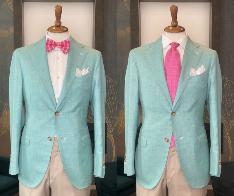 So let's proceed with a jacket in a very precious and fresh fabric for the summer: wool and silk in an aquamarine green color as refreshing as the sea. The fabric is also slightly mélange, to give a touch of dynamism and make the jacket more particular and contemporary. As you can see this jacket goes very well with both a bow tie and a tie and can be worn on formal occasions but also on chic occasions. Finally, always remember to insert the clutch bag in the pocket, we have chosen one in white cotton and we have folded it into a flower. Which option would you wear?