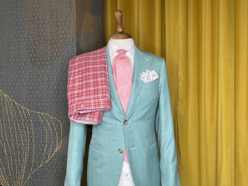 A perfect destination for the weekend or for the August holidays are all the seaside resorts. In our beautiful country, wherever you are, it is certainly not difficult to find a way to spend a couple of days by the sea, to breathe the first scent of summer and enjoy the clear April sun. Again we want to give you some inspiration for your look. With the milder temperatures typical of seaside resorts, a light and breathable wool and silk dress will be perfect. To recall the location where you will be, we suggest an aquamarine green dress, to be combined with a white and pure cotton Zephir shirt. In this festive situation you could also decide not to wear a tie, but if you have some more occasional dinner or lunch then we suggest a colorful and lively combination with a flamingo pink tie and multicheck patterned trousers in shades of coral red and pink, wool and cotoe blend. Finally, don't forget the pochette in the pocket of the flower-folded jacket!